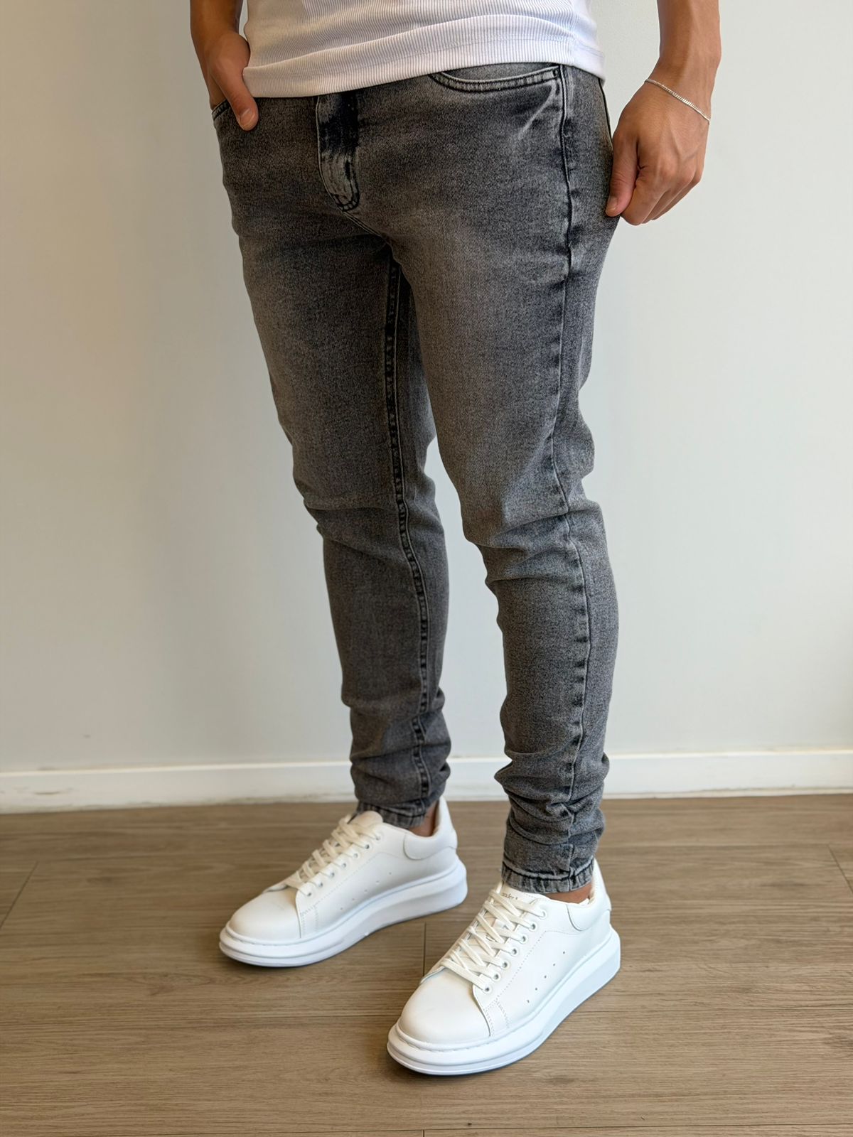 • Modelagem skinny com caimento ajustado